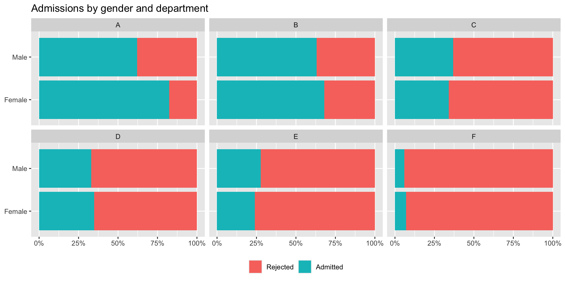 Consider dept F, the number of applications is pretty similar for both genders, the number admitted is similar, the proportion of women admitted is higher.