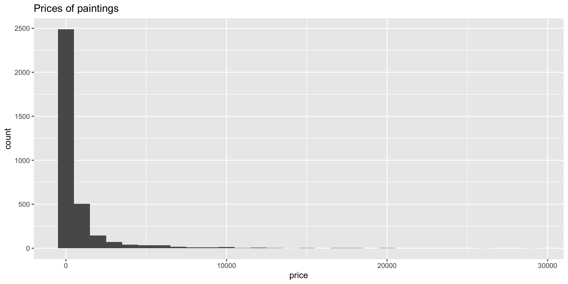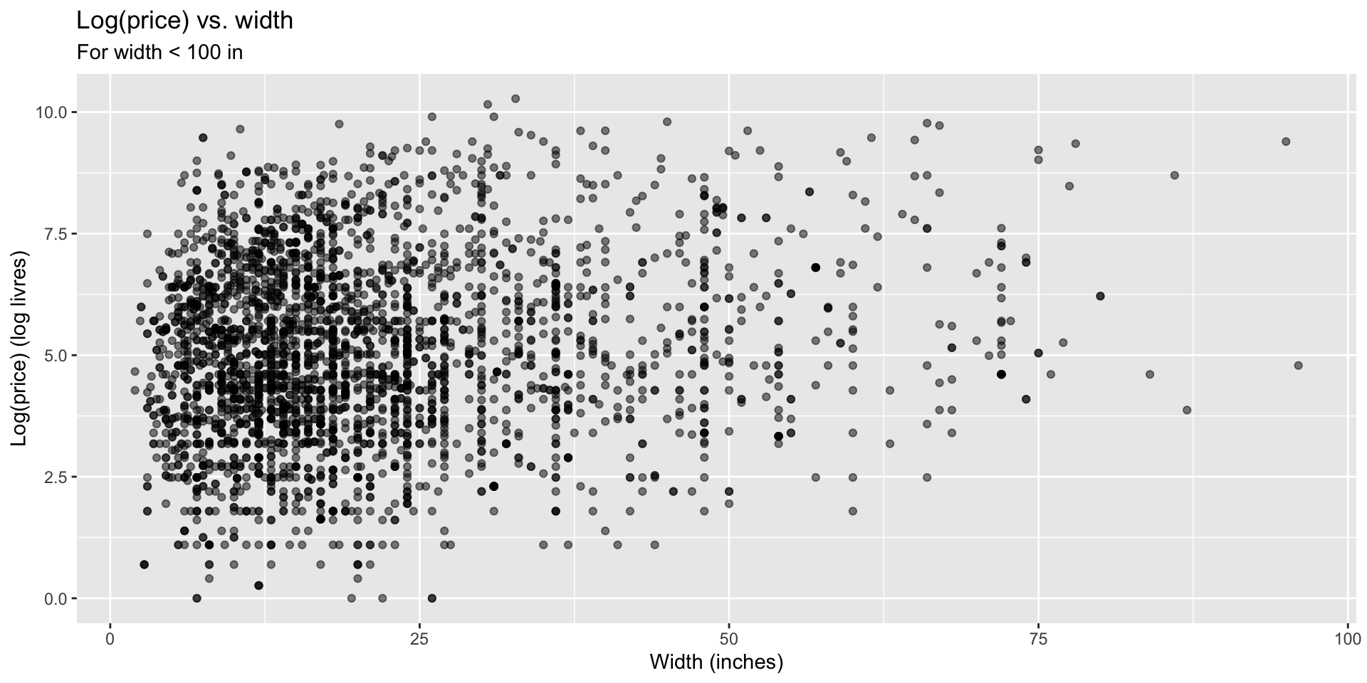 price has a right-skewed distribution, and the relationship between price and width of painting is non-linear.log function in R is the natural log: log(x, base = exp(1))
