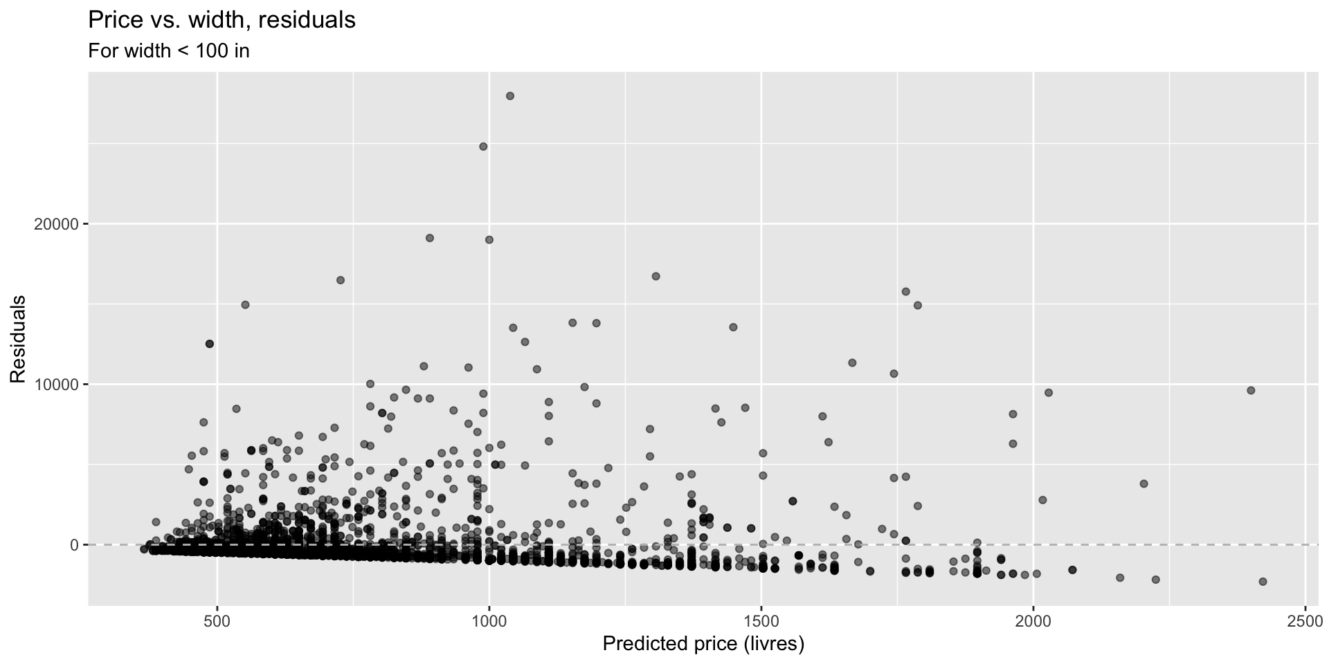 What patterns does the residuals plot reveal that should make us question whether a linear model is a good fit for modelling the relationship between height and width of paintings?