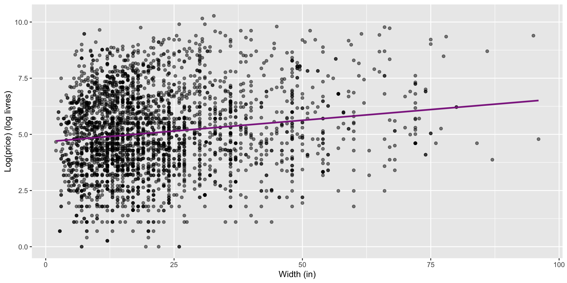 \[ \widehat{log(price)} = 4.67 + 0.0192 * Width \]
