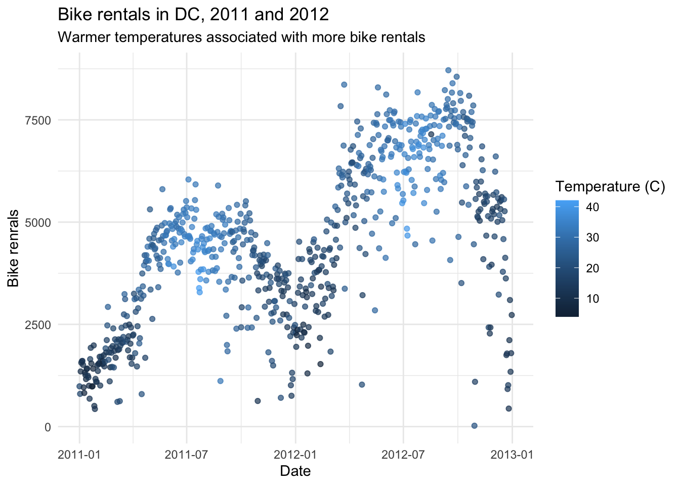 The data can be found in the dsbox package, and it’s called dcbikeshare. Since the dataset is distributed with the package, we don’t need to load it separately; it becomes available to us when we load the package. You can find out more about the dataset by inspecting its documentation, which you can access by running ?dcbikeshare in the Console or using the Help menu in RStudio to search for dcbikeshare.