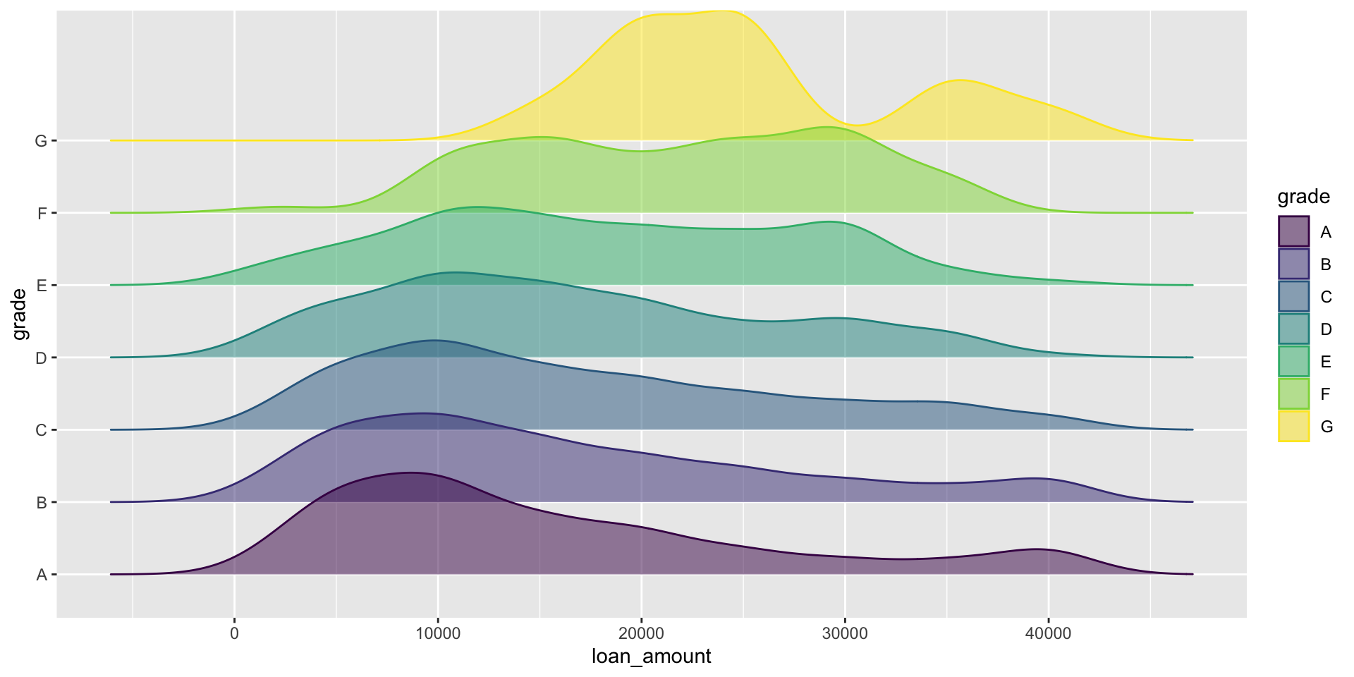 ggplot(loans, aes(x = loan_amount, y = grade, fill = grade, color = grade)) +