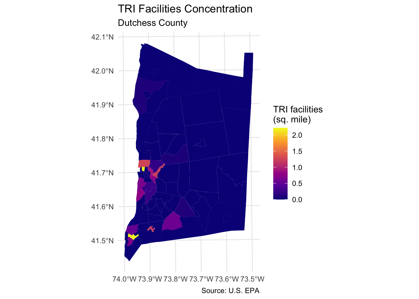 tri_facilities <- st_transform(tri_facilities, st_crs(dutchess_indicators))Explore exposure to pollutants from toxic release facilities