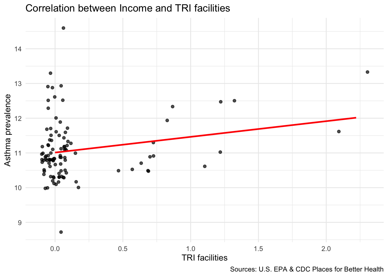 Compare TRI facilities tri_per_sqmile with the prevalence of asthma among the population: asthma_rate