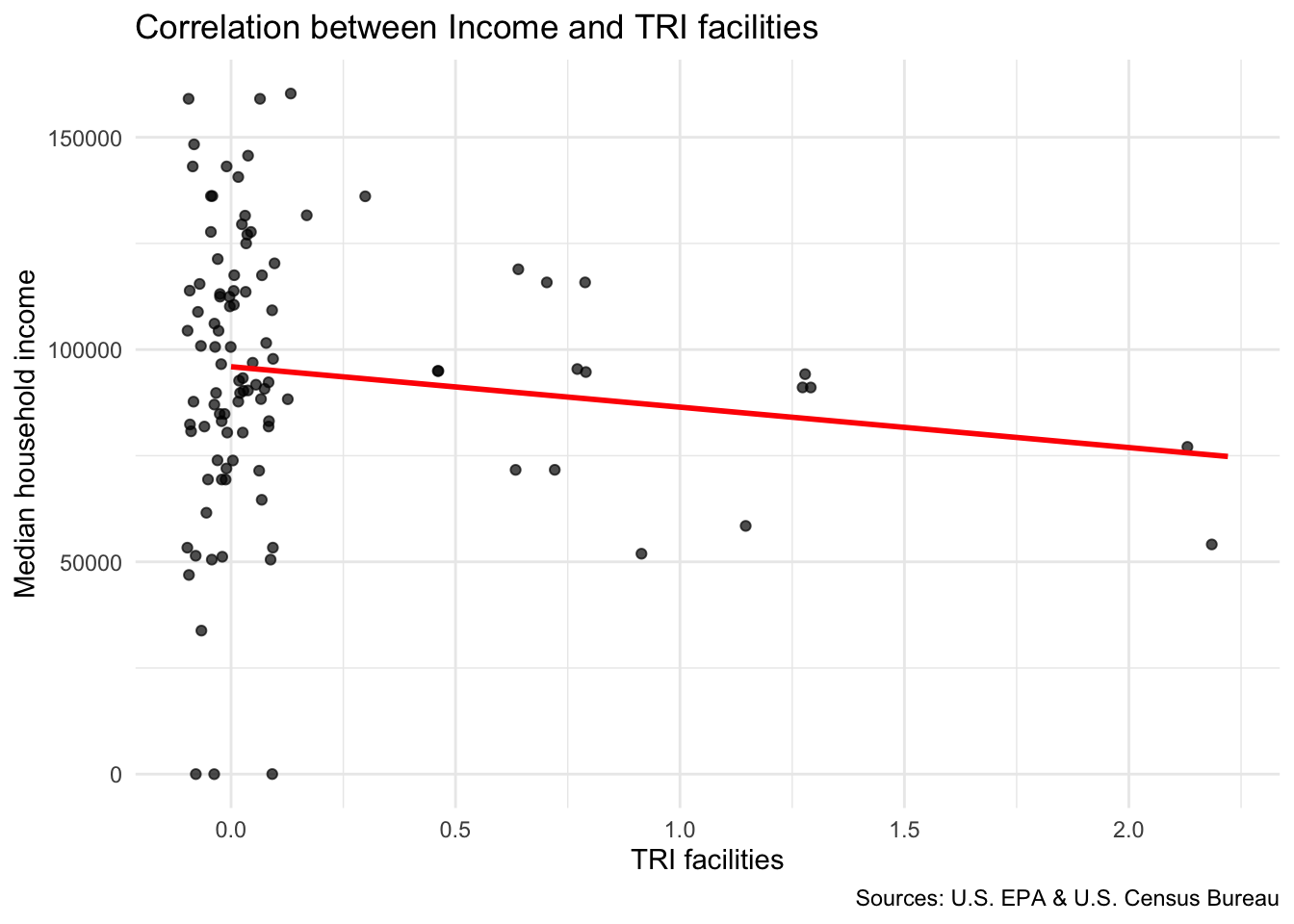We can now explore how the location of TRI facilities is associated with neighborhood-level indicators using ggplot scatterplots.