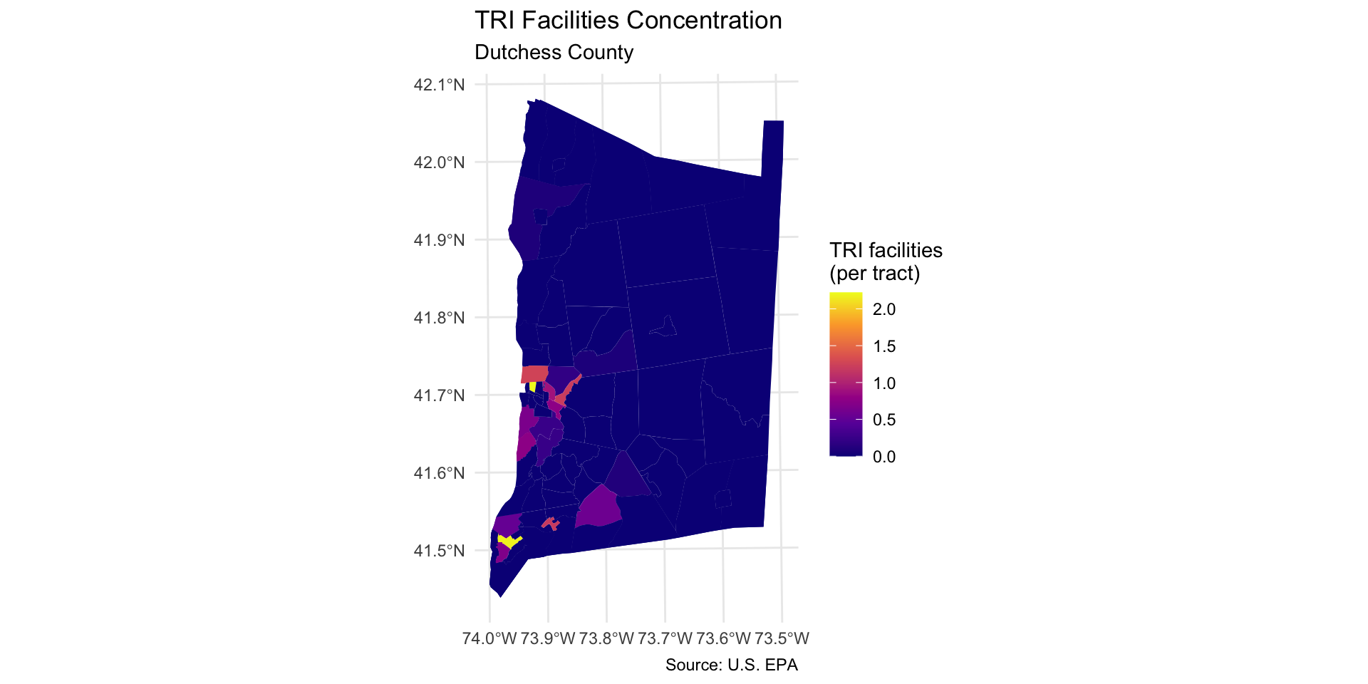 tri_facilities contains one row for each Toxic Release Inventory (TRI) facility in the Hudson Valley. We will work with those in Dutchess County, NY.For this activity we’ll use the Census Tract geography, which are roughly neighborhood-sized areal units.