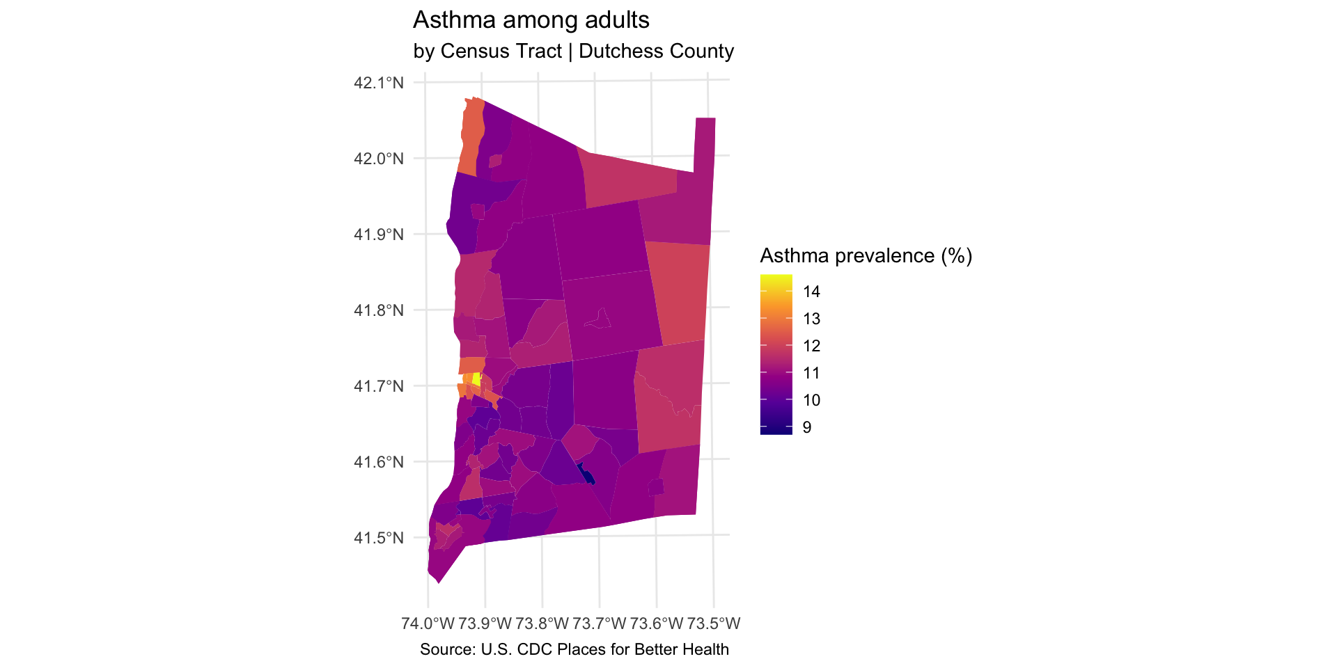 Create choropleth maps of Dutchess County, NY using ggplot.
