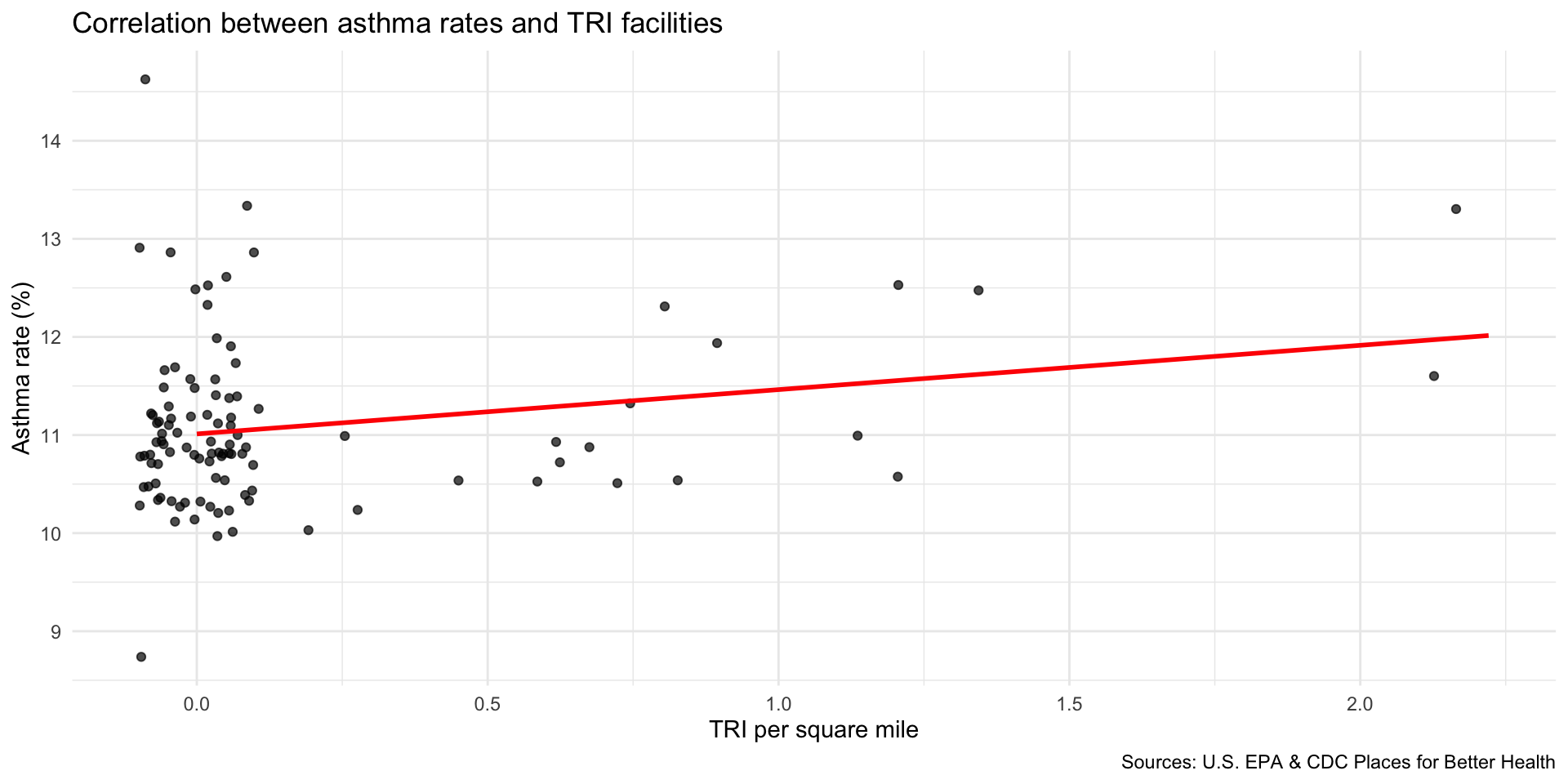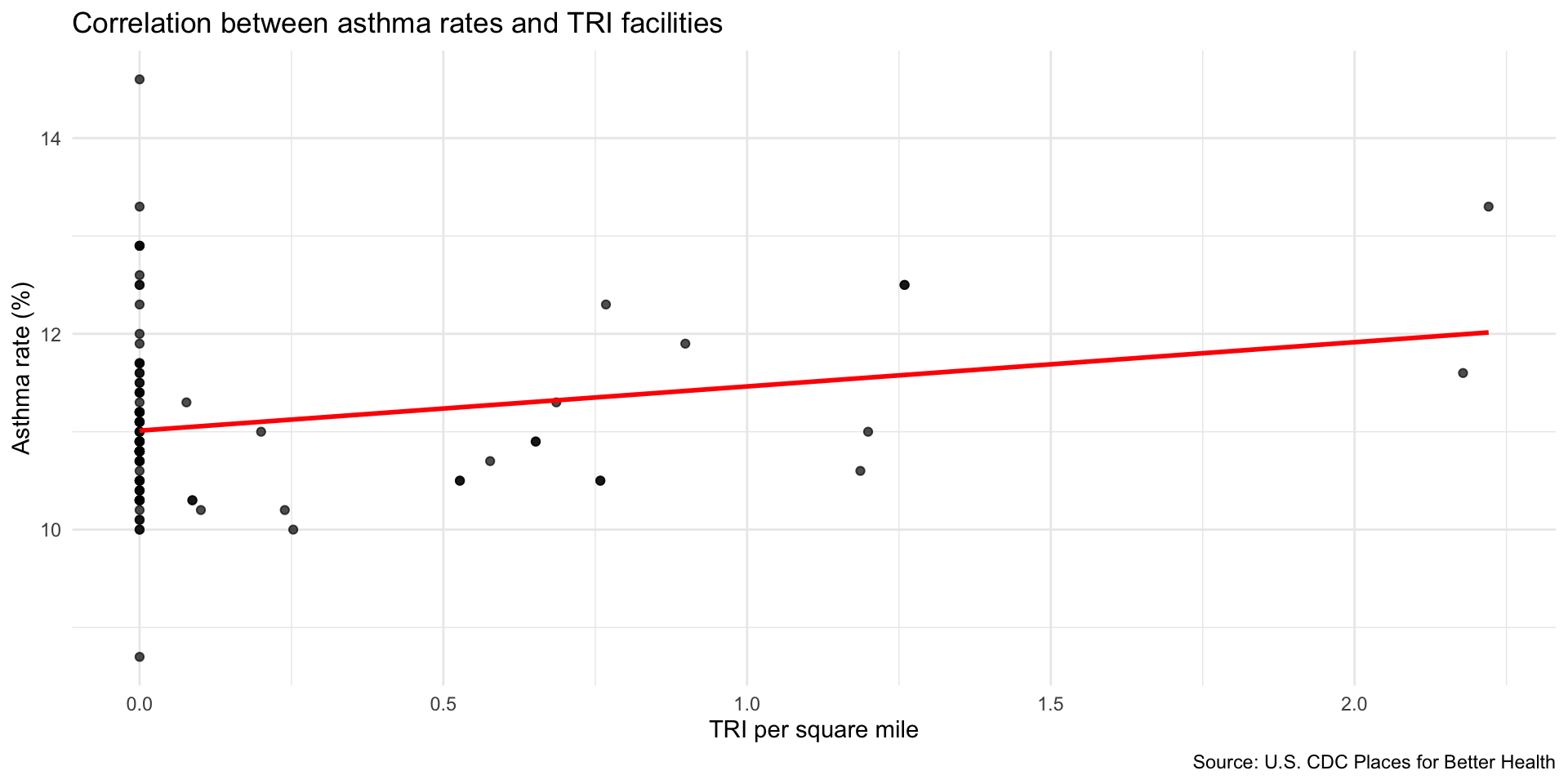 Compare TRI facilities tri_per_sqmile with the prevalence of asthma among the population: asthma_rate
