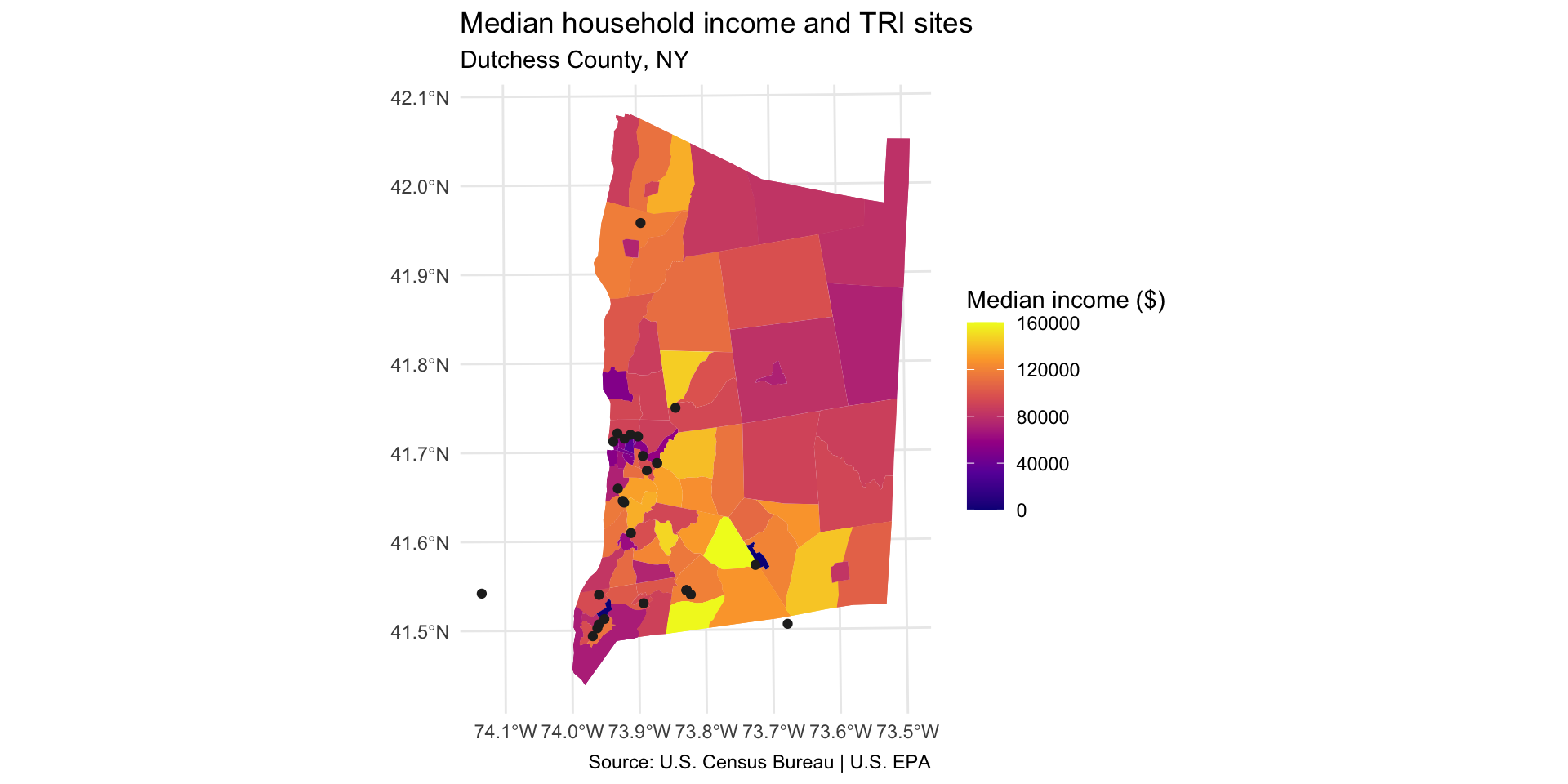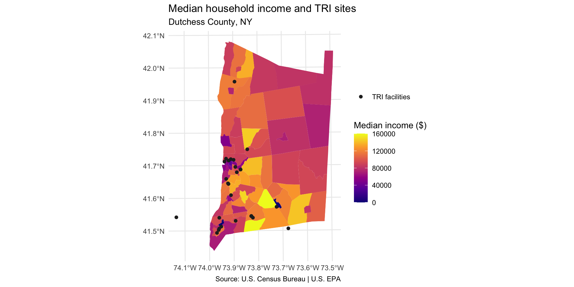 caption = "Source: U.S. EPA" to add a source note to the bottom of the map extent.Select another two or three variables from the dutchess_tri data frame to map. Change the fill = argument in the geom_sf() function to display the new indicator.