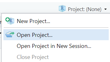 Projectpane in the top right of your RStudio window doesn’t show your newly created project name, go toOpen Projectas shown below and navigate to your project.