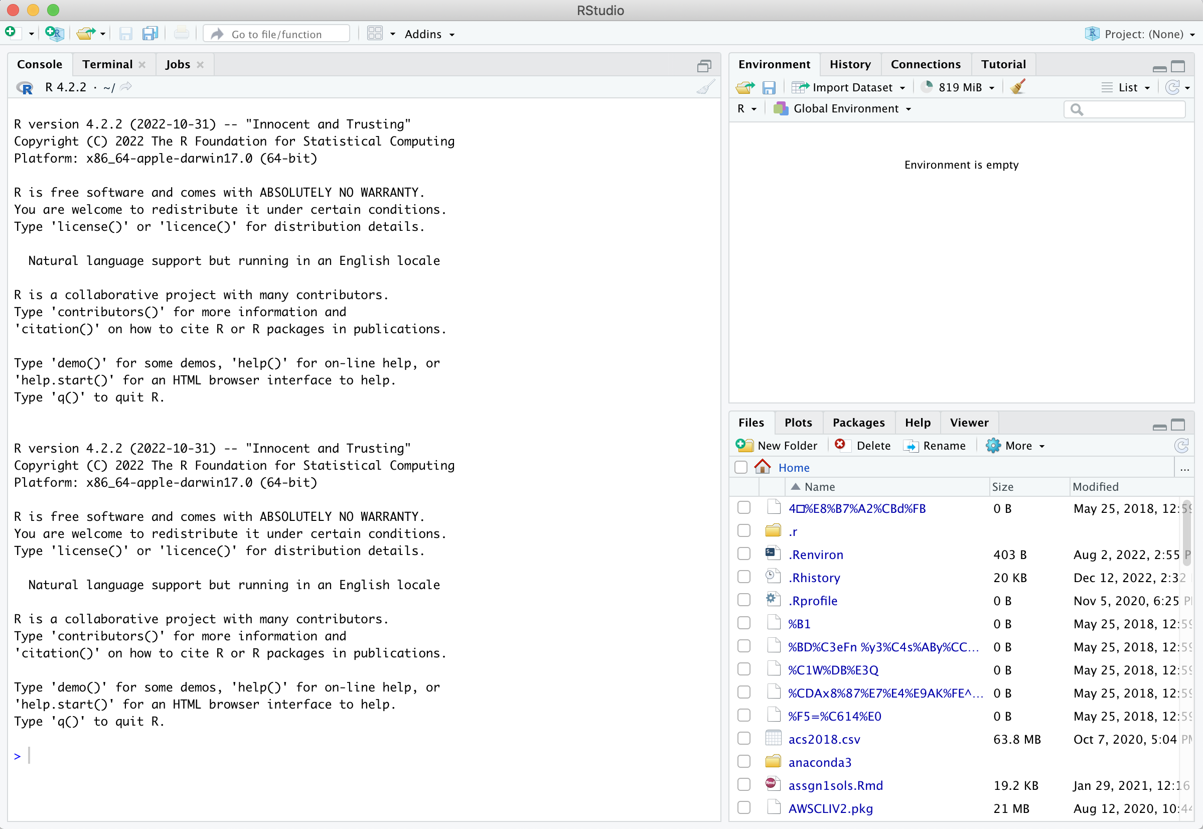If you click on the R program you just downloaded, you will find a very basic user interface. For example, below is what I get on a Mac.